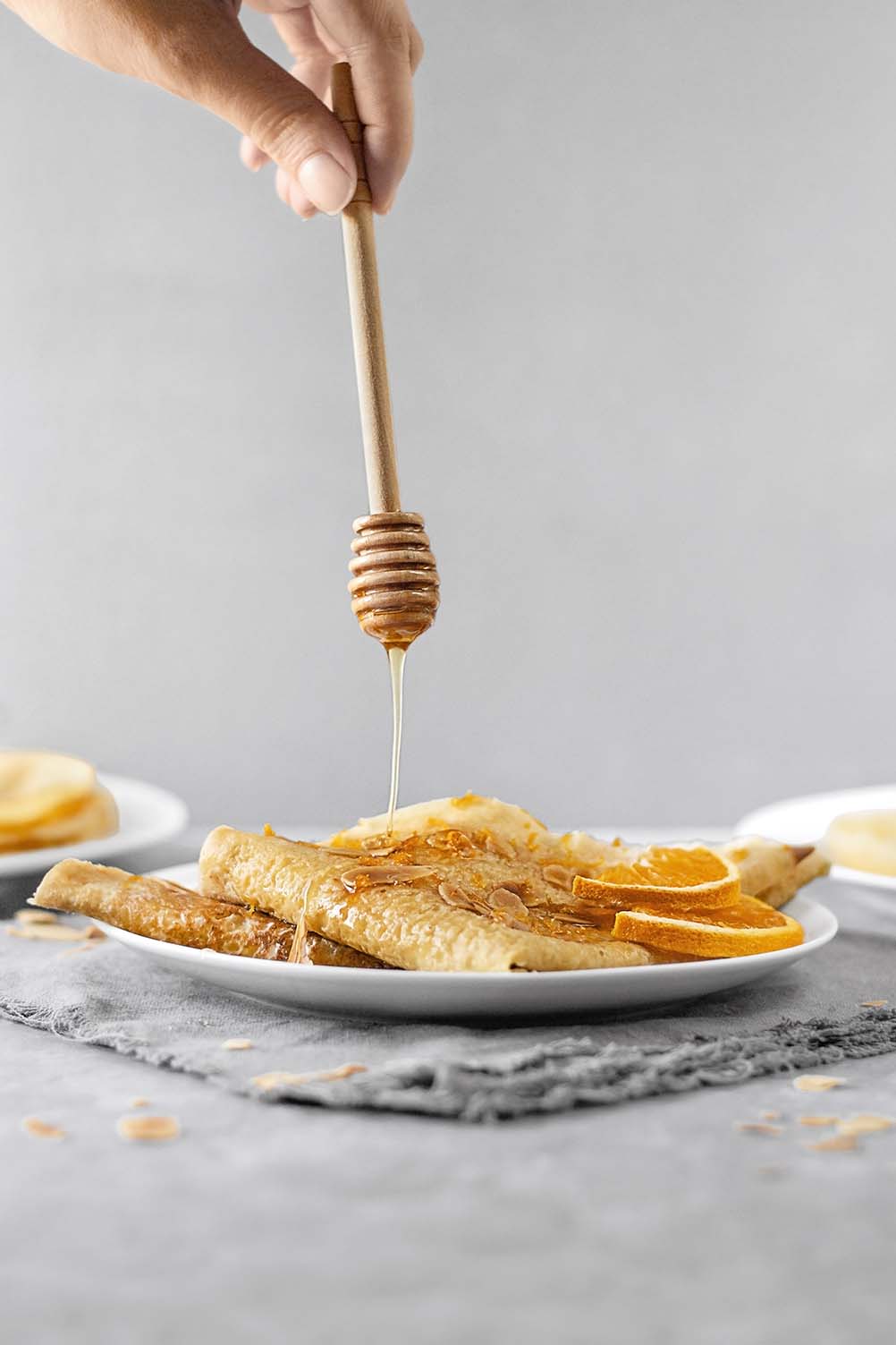 French Crepes are so nostalgic for me, taking me back to the days when my grandma would make them when we visited her. She’d pile on crepe after crepe into our plates, which we’d absolutely drown in Nutella and devour. I still LOVE making Nutella crepes regularly. However, these crepes are a little more refreshing than they are gluttonous. We’re going for a classic French crepe recipe with a hint of citrus in the batter, filled with an almond butter whipped cream and topped with orange blossom honey and toasted slivered almonds. I guarantee, they are as amazing as they sound.