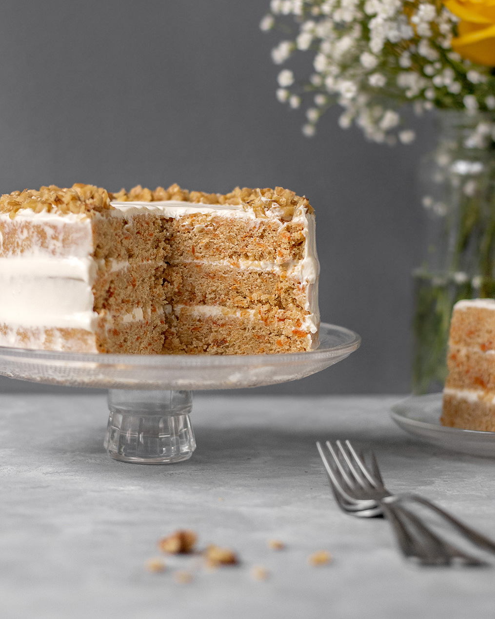 This three-layered smooth carrot cake with white chocolate cream cheese frosting and walnuts is packed with flavour and texture. Storage: Keep refrigerated in an airtight container for up to 5 days.