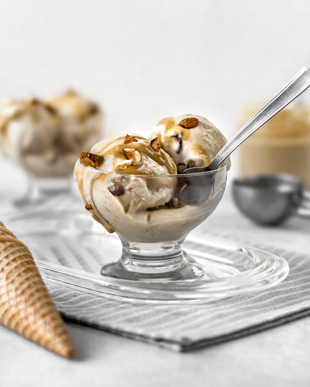 Next, you pour a generous amount of luscious hazelnut spread ice cream on top of the wafers. The coolness of the ice cream combined with the crispiness of the wafers is an absolute delight.